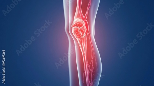Medical illustration of knee inflammation with highlighted red area on blue background