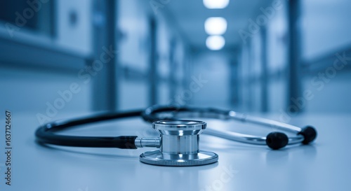 Medical Instrument: A close-up of a stethoscope lies on a clean surface, the equipment used in healthcare and medicine. It evokes the solemn atmosphere of medical profession