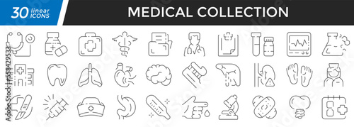 Medical linear icons set. Collection of 30 icons in black