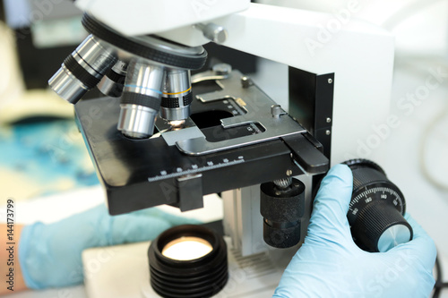 Medical microscope. Professional pharmaceutical microscope. Study of the properties of the drug when increasing. The person analyzes the components of the medicine.
