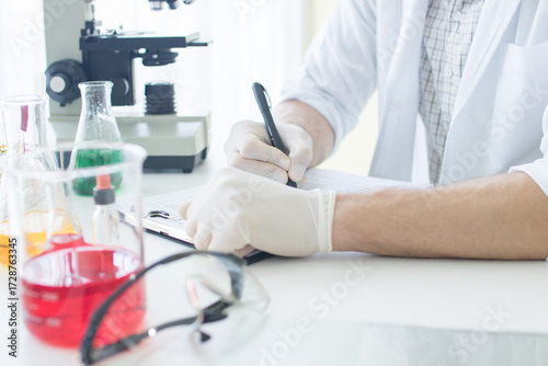 Medical or scientific researcher or man doctor looking at a test tube of clear solution in a laboratory