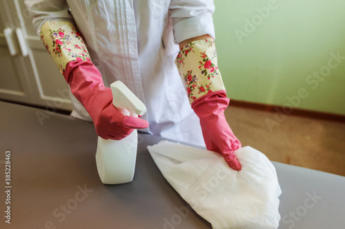 Medical personnel disinfects working place, couch, cabinet. Health worker is wearing medical gown and long pink gloves. Preventing bacteria and virus spreading concept, health care.