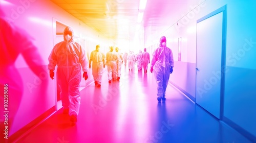 Medical professionals walking through a brightly lit corridor in protective clothing, showcasing a clean and sterile environment, vibrant colors enhancing the scene