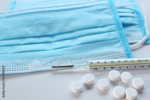 Medical protective mask, mercury thermometer and medicine pills, concept for quarantine, COVID-19, coronavirus, treatment prevention.