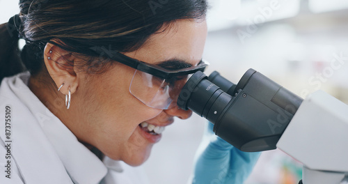 Medical, research and woman with microscope, biotech and check experiment for particles, dna and virus cure. Person, smile or scientist with lab equipment, testing or studying sample for breakthrough