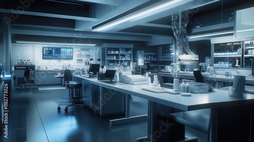 Medical research lab with sleek diagnostic tools and clean lab benches.