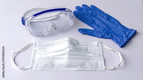 Medical Safety Gear Including Face Mask, Protective Goggles, and Blue Disposable Gloves for Health and Hygiene Applications
