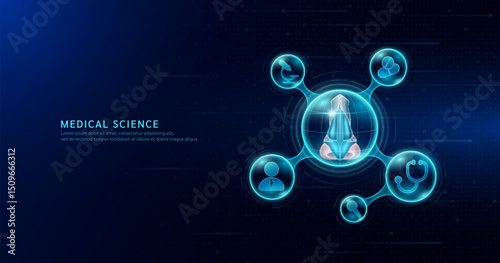 Medical science. Human nose organ inside transparent molecule with icons doctor pill stethoscope magnifying glass and plus sign. On dark blue digital technology background. Vector EPS10.