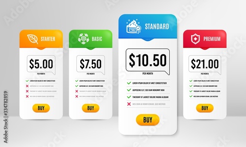 Medical shield, Eco organic and Cream icons simple set. Price table template. Leaf sign. Medicine protection, Bio ingredients, Best lotion. Environmental. Healthcare set. Vector