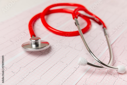 Medical stethoscope, red heart, and cardiogram on a color background. ECG, Heart wave, heart attack, cardiogram report. Cardiogram pulse trace and heart concept. Healthcare.Space for text
