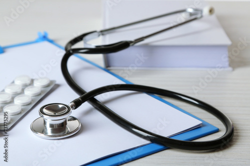 Medical stethoscope with book and folder on wooden table
