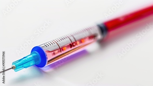 Medical syringe with a needle on a white surface, filled with red liquid, essential for healthcare professionals in hospitals