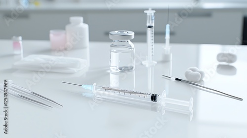Medical syringes, vials, and medical instruments on a sterile white surface in a clinical setting.