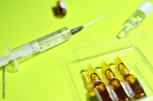 Medical syringes with a needle and injection. Anesthesia with essential and essential medicines. New rapidly spreading Coronavirus, originating in Wuhan, China