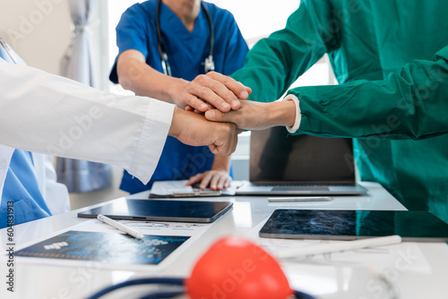 Medical team meeting with doctors in white lab coats and surgical gowns sitting at table discussing patient history. success of medical health care The concept of working with a doctor. Close up.