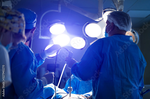 Medical team performing surgical operation in bright modern surgery room. Operating theatre. Modern equipment in clinic. Emergency room.