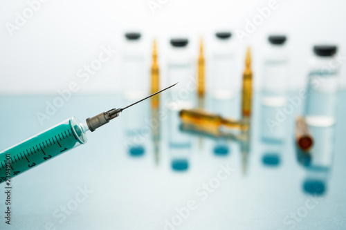 Medical Vaccine vial hypodermic injection treatment disease care in hospital and prevention illness.