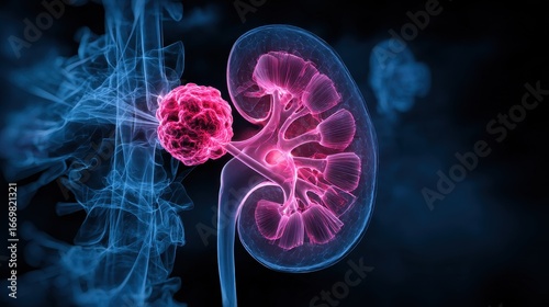 Medically 3D illustration showing a tumor in right kidney, x-ray style.