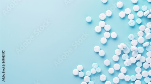 Medication Pills on Light Blue Background with Copy Space