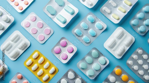 Medications displayed in blister packs on blue backdrop