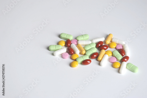 Medications or drugs in the form of tablets, of various sizes, shapes and colors. Tablets for oral administration on a white background. Close-up. Free space to place text.