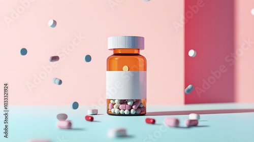 Medicine Bottle with Colorful Pills on Pink and Blue Background