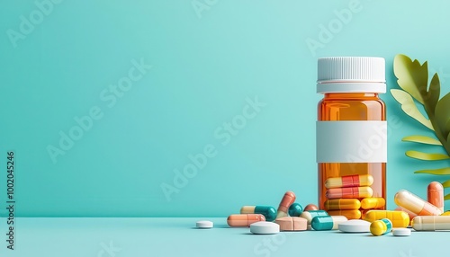 Medicine bottles, colorful vitamins scattered, clean background, watercolor style