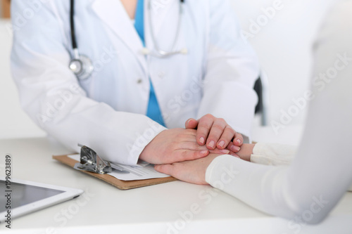 Medicine doctor hand reassuring her female patient closeup. Medicine, comforting and trusting concept in health care
