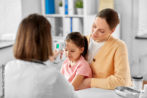 medicine, healthcare and pediatry concept - mother with sick little daughter and doctor measuring temperature with infrared forehead thermometer at clinic