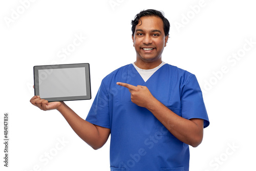 medicine, healthcare and technology concept - happy smiling indian doctor or male nurse in blue uniform showing tablet pc computer over white background