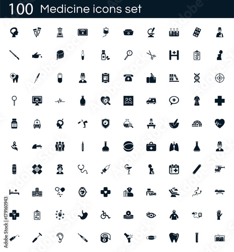 Medicine icon set with 100 vector pictograms. Simple filled medical icons isolated on a white background. Good for apps and web sites.