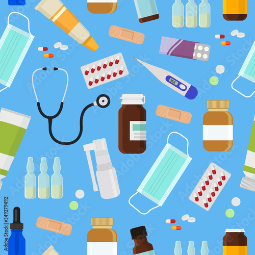 Medicine. Pharmacy. Medicines. Pattern. Seamless background. Vector illustration with infinitely repeating elements