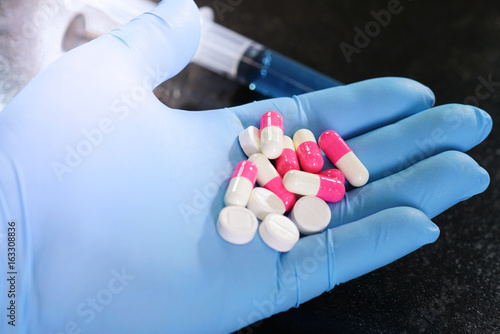 Medicine pills in the palm of the doctor wearing blue gloves.