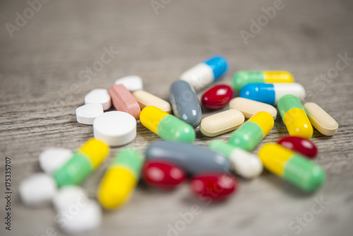 Medicine pills, tablets and capsules on wooden background.