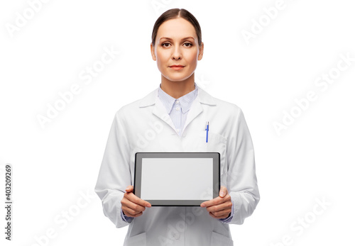 medicine, profession and healthcare concept - female doctor or scientist in white coat with tablet pc computer
