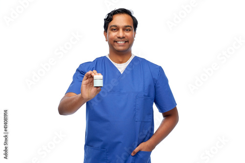medicine, profession and healthcare concept - happy smiling indian doctor or male nurse holding jar of pills over white background