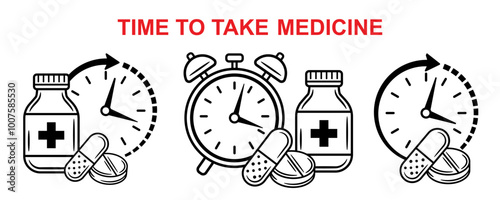Medicine time, medical pill take hour timetable, medication day schedule line icon set. Alarm clock timer. Pharmacy medicinal tablet, vitamin capsule dose. Health medicament. Disease treatment. Vector