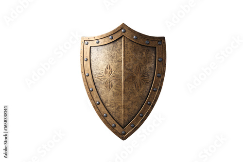 Medieval bronze shield with twin cross emblems and metal studs along edges, isolated on a transparent background