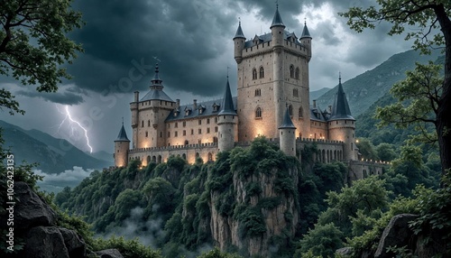 Medieval Castle Enveloped by Vines Against a Stormy Sky
