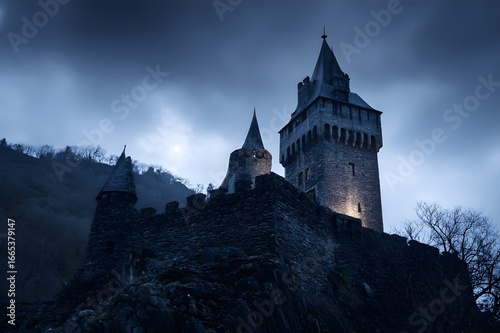 Medieval castle turreted dusk epic architectural scene showcasing ancient fortresses and mystic twilight glow