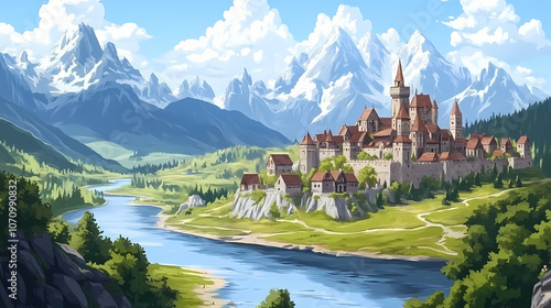 Medieval fantasy city built over hills, view of the river and mountains. Fantasy. Illustration