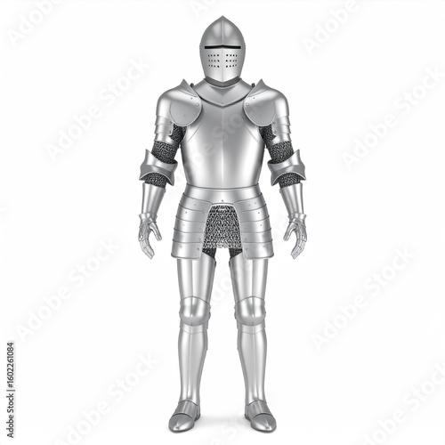 Medieval knight armor full body front view metallic finish with chainmail underlay on white background, detailed protective gear evokes strength and history