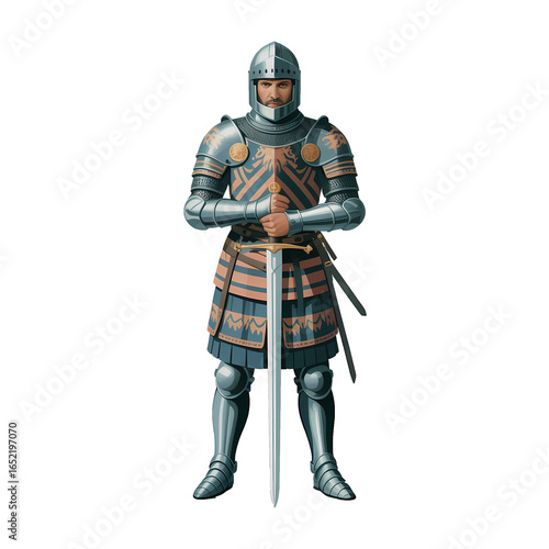 Medieval knight in armor swiftly advancing with sword and shield during a crusade in a fictional landscape