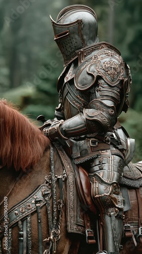 Medieval knight in ornate armor riding a horse through a lush forest during a serene afternoon