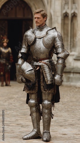 Medieval knight in ornate full-body armor standing in historical courtyard.