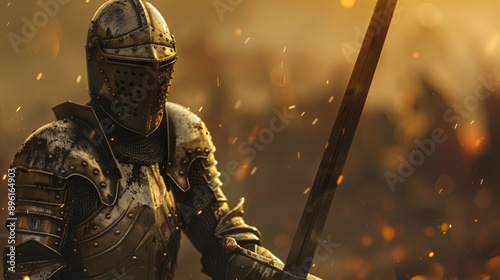 Medieval knight in shining armor standing in a battlefield.