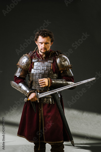 Medieval man knight in armor and weapon on dark background. Portrait of the knight