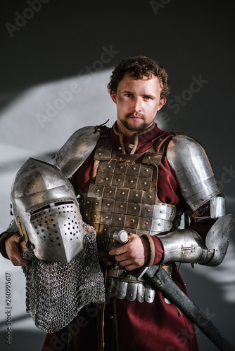 Medieval man knight in armor and weapon on dark background. Portrait of the knight