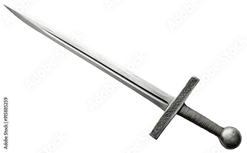 Medieval sword lying on a wooden surface, cut out - stock png.