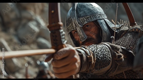 Medieval Warrior Drawing Bow in Detailed Battle Armor